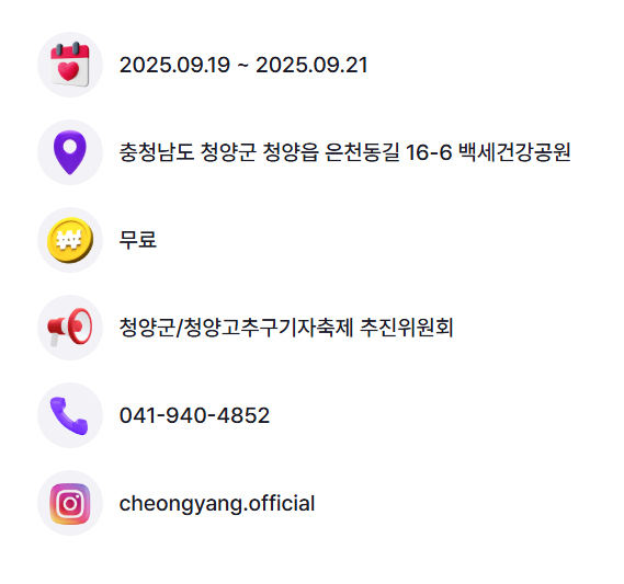 청양이라는 지역이 가진 자연환경, 전통문화, 먹거리, 주민 정서가 어우러진 콘텐츠형 축제로 매년 발전하고 있다.